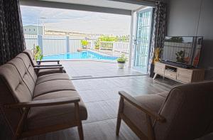 Die freistehende Unterkunft verfügt über drei Schlafzimmer und zwei Badezimmer mit Duschen. Der klimatisierte Innenbereich umfasst eine voll ausgestattete Küche mit Herdplatte, Mikrowelle, Kühlschrank, Kochutensilien, elektrischem Wasserkocher sowie Grillmöglichkeiten. Die Gäste können sowohl im Innenbereich als auch auf der Terrasse mit Blick auf den Pool oder Garten speisen. Der Wohnbereich ist mit einem Flachbildfernseher ausgestattet, der Streaming-Dienste bietet, sowie einem Radio zur Unterhaltung.